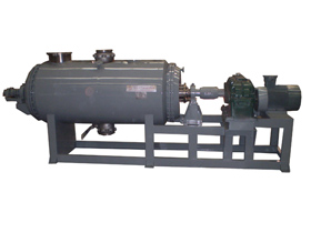 本机是一种新颖卧式间歇式真空干燥设备,湿物料经传导蒸发,带有刮板搅拌器不断清除热面上的物料,并在容器内推移形成循环流,水份蒸发后由真空泵抽出。