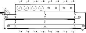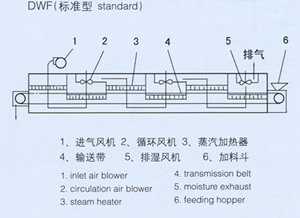 物料由加料器均匀地铺在网带上,网带一般采用12-60目不锈钢丝网,由传动装置拖动在干燥机内移动。干燥机由若干单元组成,每一单元热风独立循环,部分尾气由专门排湿风机排出,废气由调节阀控制,热气由下往上或由上往下穿过铺满物料的网带完成热量与质量传递的进程,带走物料水份。网带缓慢移动,运行速度可根据物料温度自由调节,干燥后的成品连续落入收料器中。上下循环单元根据用户需要可灵活配备,单元数量亦可根据需要选取。
